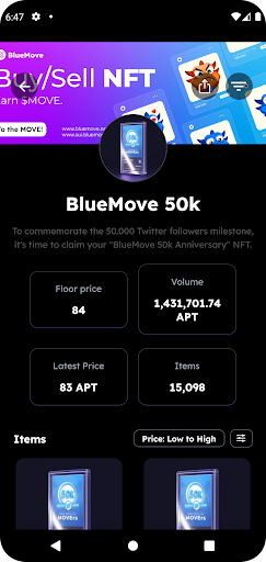 "BlueMove's mobile application is the easiest method to buy or sell your NFT collection and explore fresh assets from the largest NFT Marketplace on Aptos and Sui Blockchain.